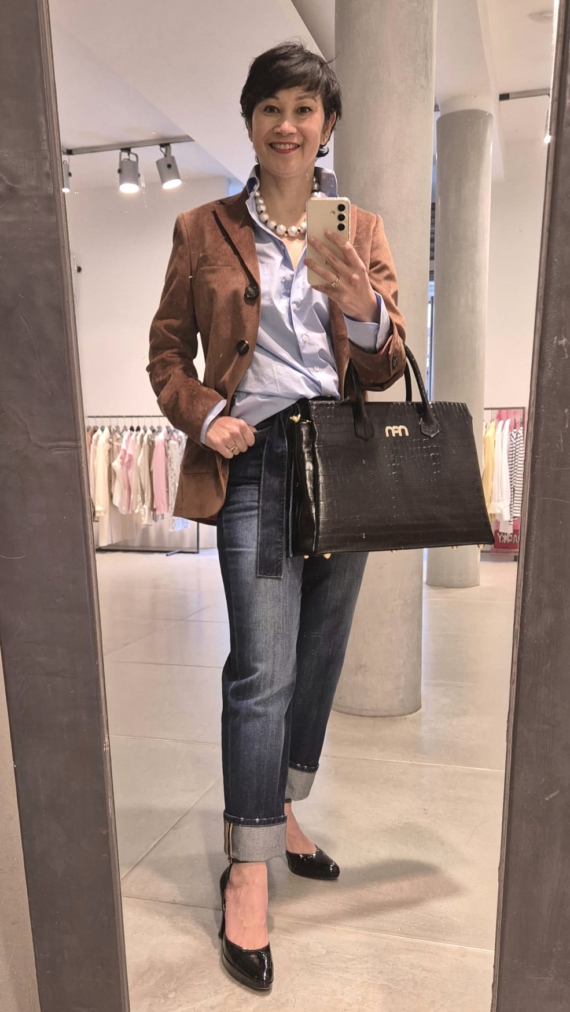 Tip van een nieuwe NAN klant. “ Recent ben ik voor het eerst de NAN Brandboutique in Rotterdam binnen gestapt. Via een van mijn beste vriendinnen had ik al over dit mooie merk gehoord. Online bestellen had ik natuurlijk ook kunnen doen, maar voor werk was ik toch in de buurt en dan is doorpassen heel fijn. Die dag heb ik mijn capsule garderobe op gebouwd: inderdaad een zwart pak en een navy blazer van NAN gekocht. Een goeie jeans en witte blouse had ik al. Toen ik pas de NAN nieuwsbbrief ontving, waarin dit bruine pak stond, heb ik het NAN damespak er meteen bij gekocht. Deze keer wel online besteld, omdat ik na die passessie nu goed zelf kan inschatten welke maat voor mij het best is. ”